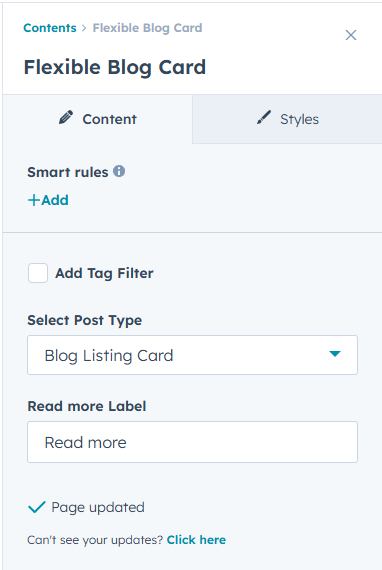 The Content Customization settings allow you to manage what content appears in each blog card and how it’s displayed. You can dynamically connect blog posts, define the number of cards, and control content visibility.