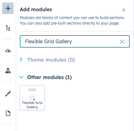 Integration: In the Marketing section, choose Website Menu > Website Pages and add the "Flexible Grid Gallery" module to the page you want.